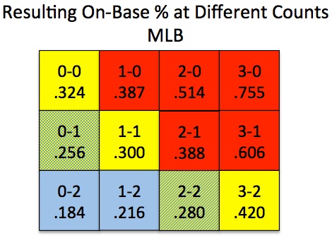 Below is a chart of data of MLB on-base percentage as hitters pass through different counts. Of course, everyone starts at 0-0, so the MLB OB% average is .324 (note there are some quirks in this data and it is a couple decades old, but conclusions are right).