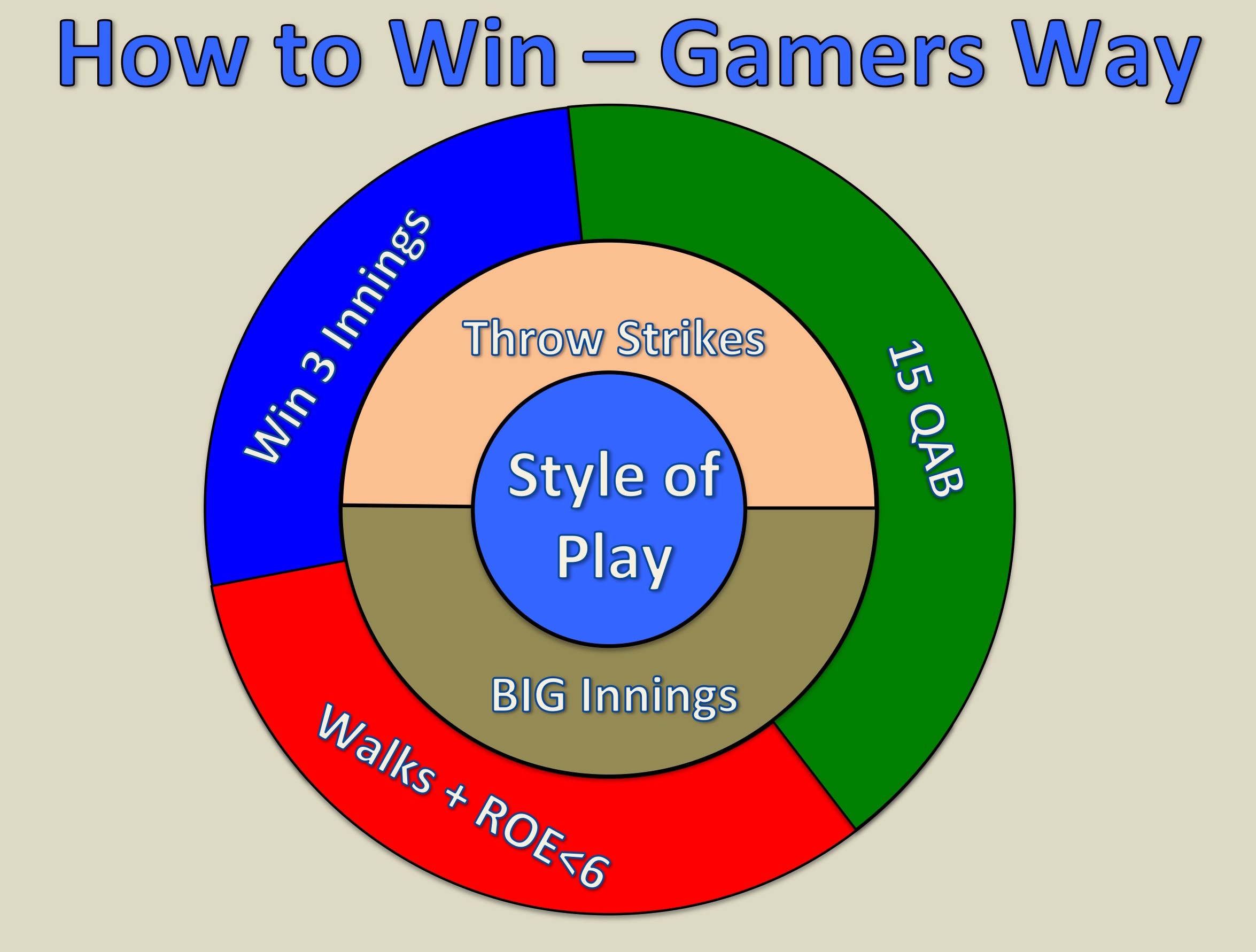 Here is the simple three- part recipe for winning baseball games at the youth level: Win 3 innings (you will win 90% of the game that you achieve this) Have 15 or more Quality At Bats (you will win 80% of the games that you achieve this). Limit Walks + Reached on Errors to 5 or less (you will win 80% of the games that you achieve this) In a single game, if you accomplish 2 of the three above, you will win >90% of the time. If you accomplish all 3 of the above, you will win 98% of the time. It is truly a recipe for winning. It has only happened to me in one in 10 years — where we have accomplished all three goals and lost the game.